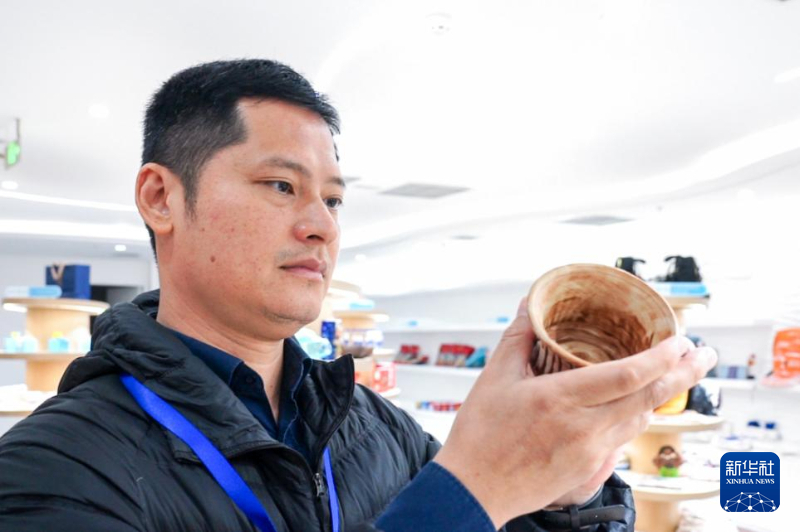 許桂榮在殼丘頭遺址博物館檢查館內陳列的文創產品。新華網 肖和勇 攝