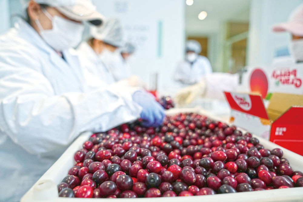 就這樣從無到有,從少到多,從掛果到豐產,“日出之城”撫遠,悄悄成為“東方蔓越莓之都”?!皣鴥嚷捷M近年增長強勁,市場潛力大?!睎|北農業大學現代農業發展研究中心主任郭翔宇說,蔓越莓種植回報非常高,一畝蔓越莓相當于50畝水稻或100畝大豆的收益。