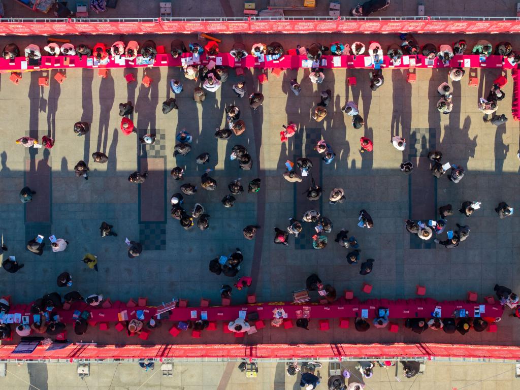 2025年1月15日,求職者在招聘會現場了解招聘信息(無人機照片)。新華社發(阮雪楓攝)