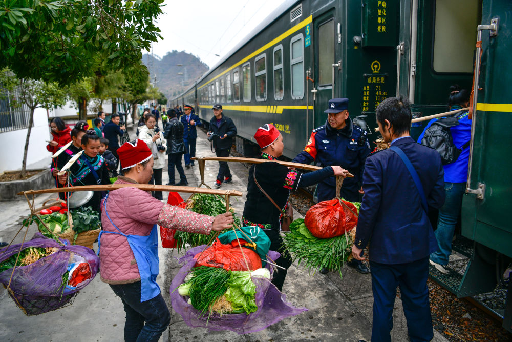 1月18日,在滬昆鐵路六個(gè)雞火車站,村民準(zhǔn)備登上5640次列車售賣蔬菜和年貨。新華社記者 楊文斌 攝