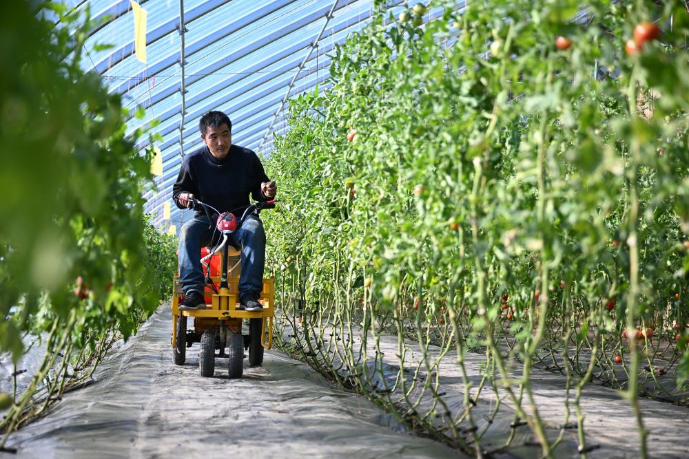 在延安市寶塔區劉興莊村,劉浪浪駕駛農機在大棚內運送物資。新華社記者 張斌 攝