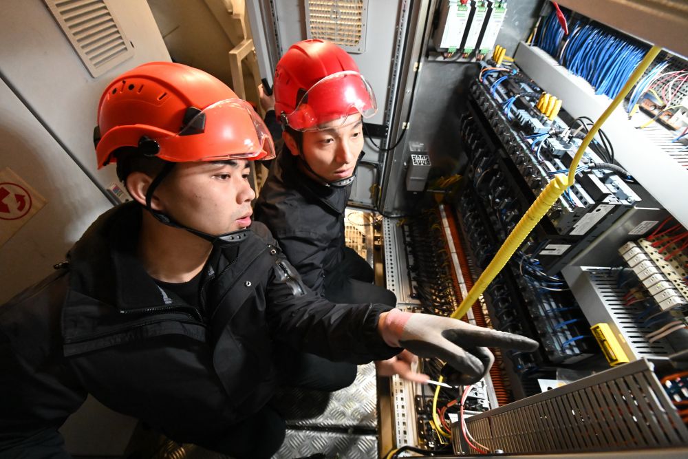 鄭桂雄(左)和張宗昌在機艙內(nèi)討論風(fēng)機故障處理方法。新華社記者 林善傳 攝