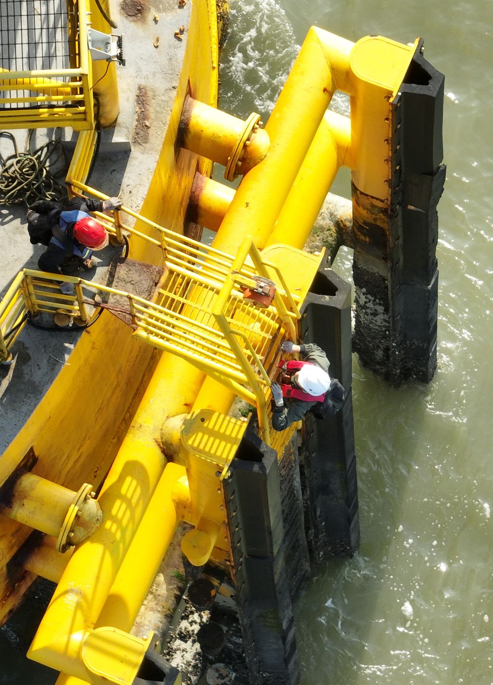 記者爬上海上風(fēng)電平臺基座。新華社記者 林善傳 攝