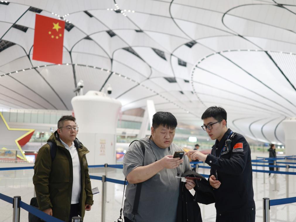 執(zhí)勤現場,民警為旅客解疑答惑。新華社記者 任沁沁 攝