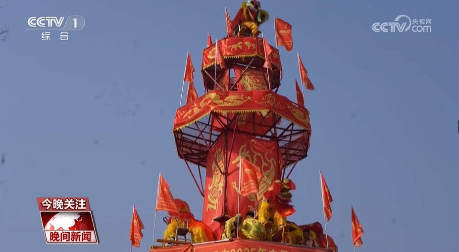 百獅齊舞迎新春,在河南漯河,一場非遺表演“九獅飛天”熱鬧上演。只見舞獅者腳踩空中繩索,跳躍、騰空,在17米高的“通天塔”上展開了一場獅王爭霸賽。精彩的表演引得觀眾連聲叫好。