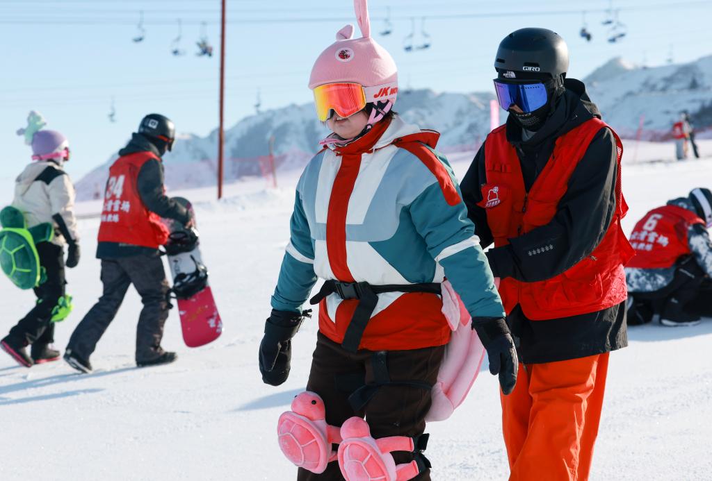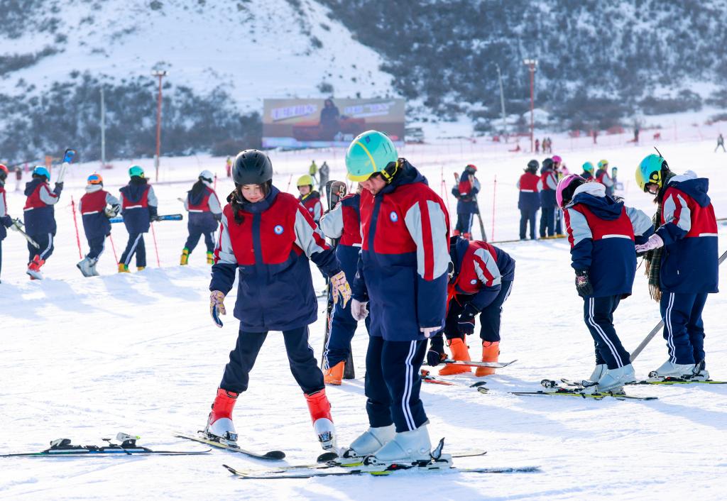 2024年12月25日,在位于烏魯木齊縣的新疆白云國際滑雪場,烏魯木齊縣永豐中學的學生在上滑雪課。新華社記者 王菲 攝