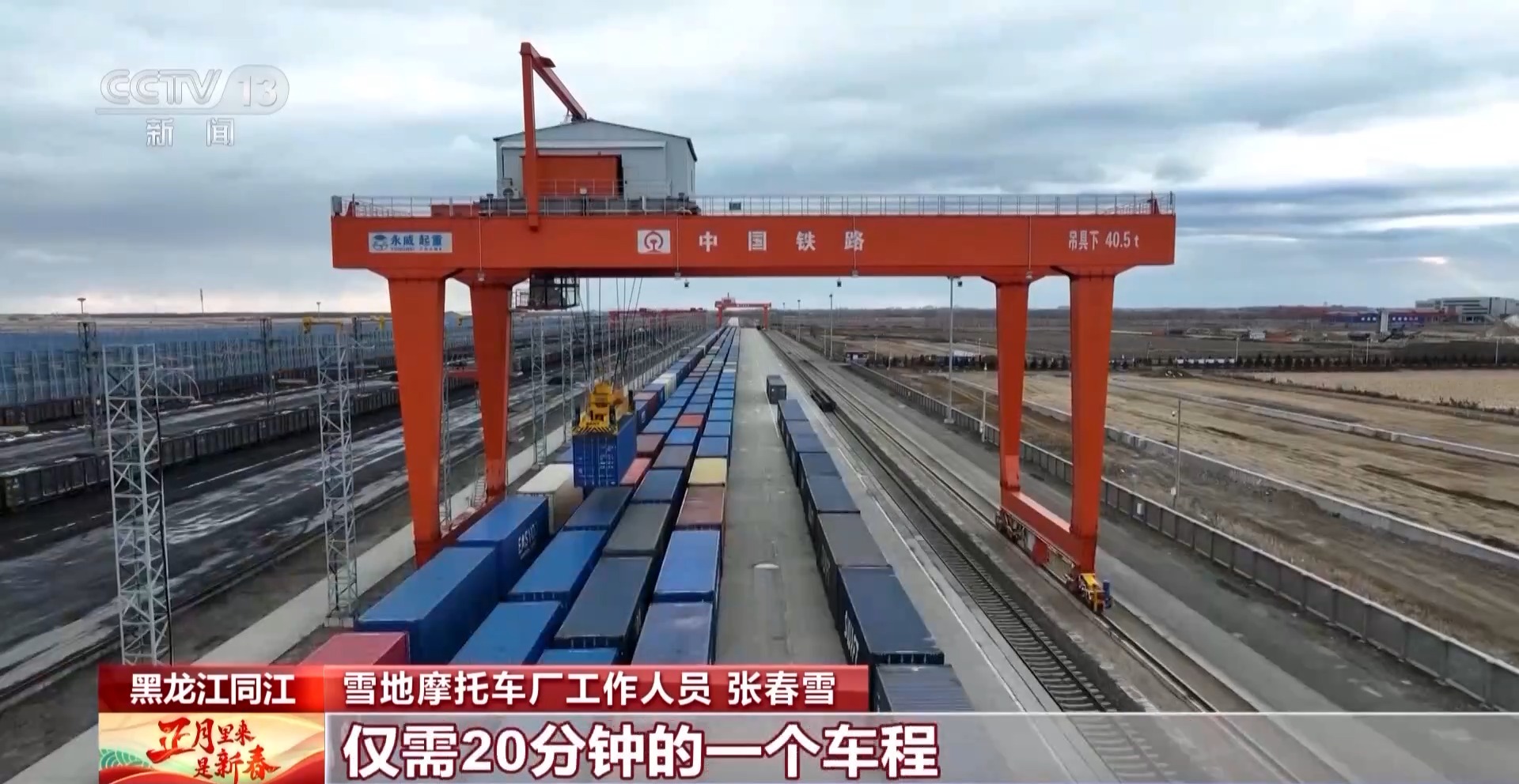 雪地摩托車廠工作人員 張春雪:工廠的產品從生產裝車,到咱們對岸的是俄羅斯的下列寧斯闊耶口岸,僅需20分鐘的車程。