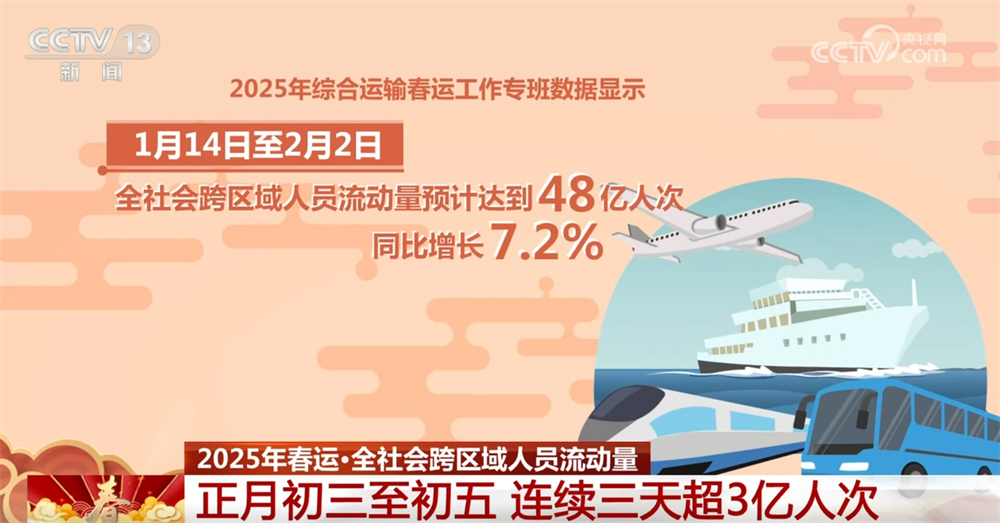 來自2025年綜合運輸春運工作專班數據顯示:1月14日至2月2日,全社會跨區域人員流動量預計達到48億人次,同比增長7.2%;正月初三、初四、初五已連續三天超3億人次,均超去年同期水平。
