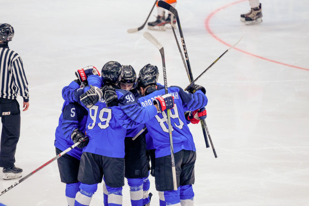 2月3日,科威特冰球隊球員在比賽中慶祝進(jìn)球。新華社記者 王建威 攝
