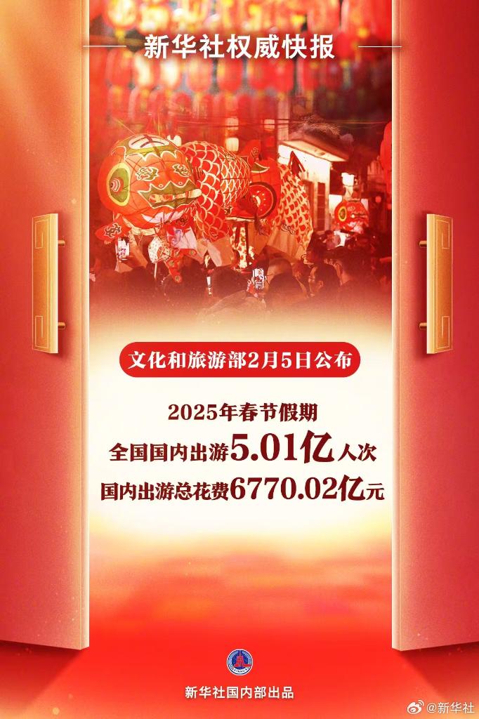 2月5日,文化和旅游部公布春節假期最新數據:春節假期8天,全國國內出游5.01億人次,同比增長5.9%;國內出游總花費6770.02億元,同比增長7.0%。全國出游人次和總花費再創新高!