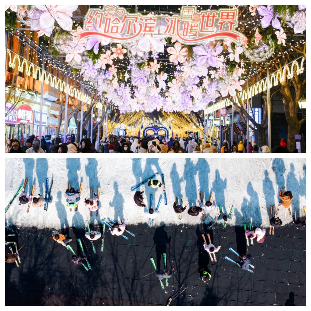 拼圖:(上圖)1月30日,游客在哈爾濱中央大街上游玩、拍照。(下圖)2月3日,游客在江蘇省淮安市馬頭鎮的古運河滑雪場滑雪(無人機照片)。