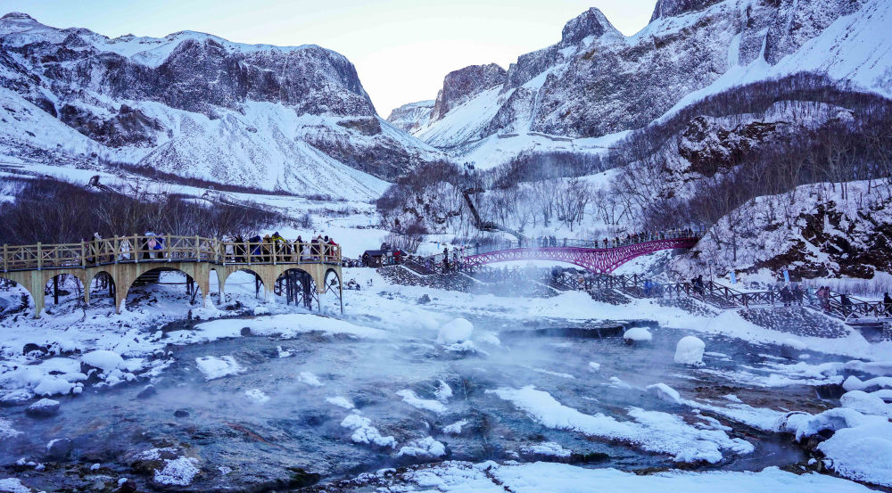 長白山天池以北的延邊州,溫泉室外的樹枝上覆滿積雪,泡池內滾燙的地熱源源不斷。伸出腳尖觸水,一股暖意傳遍全身。延邊云集安圖火山泉、龍井氟溫泉、延吉低氘溫泉等多種特色溫泉,吸引海內外眾多游客慕名而來。