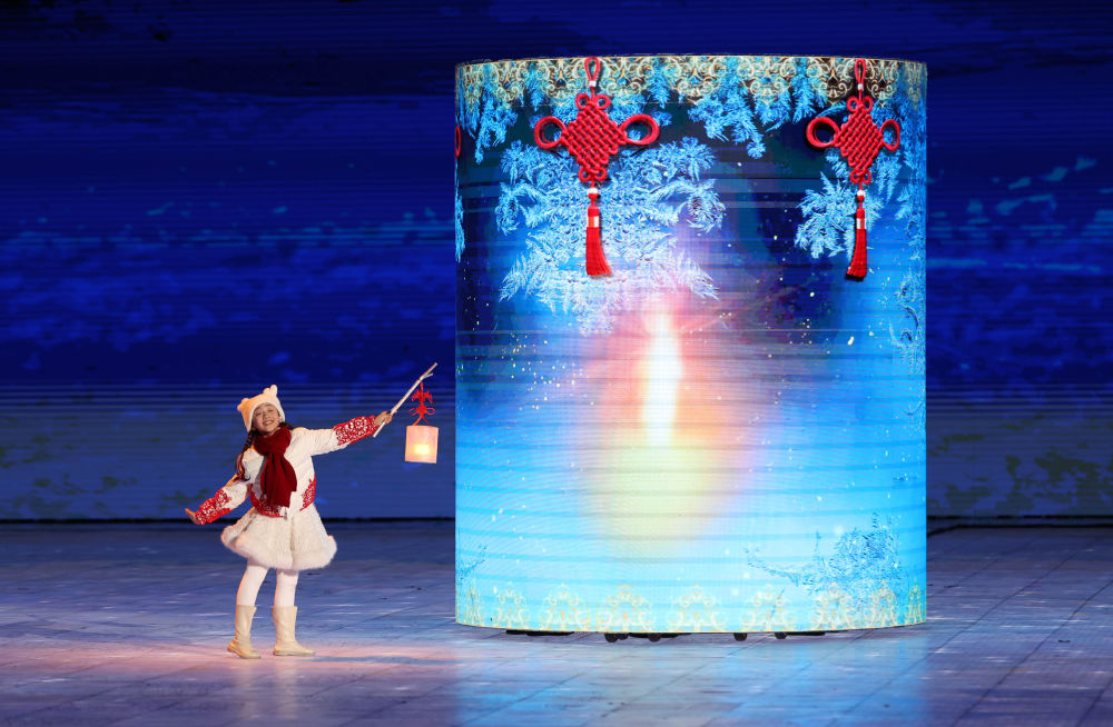 一個(gè)穿白衣裙、戴紅圍巾的女孩提著盈盈微光的小冰燈,點(diǎn)亮舞臺(tái)中央的大冰燈。隨后,34名孩童手提冰燈圍合環(huán)抱在一起,象征本屆亞冬會(huì)34個(gè)亞洲參賽國(guó)家和地區(qū)凝心聚力,共同點(diǎn)亮夢(mèng)想。