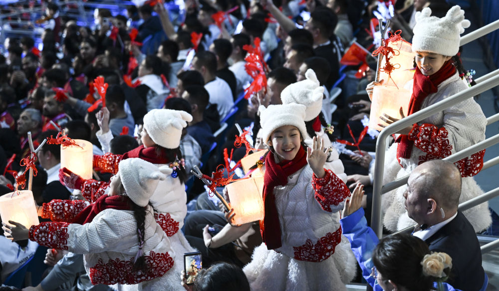 當(dāng)晚,在開幕式分會(huì)場(chǎng)冰雪大世界,手提冰燈的孩子們來到占地百萬(wàn)平方米的園區(qū),與冠軍火炬手一同滑行,見證主火炬點(diǎn)燃。