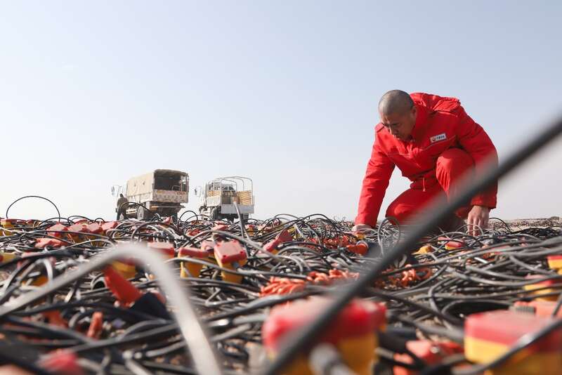 在施工現場,需要檢測的無線節點儀器和檢波器串擺成了一個巨大的圓形圖案,李國忠和物探隊員一起為這些儀器做“健康體檢”。李國忠介紹,無線節點儀器穩定性高、便于攜帶,主要用在高難山體區。在沙漠區采用高精度可控震源,既保證了施工質量、提高了施工效率,也保護了生態環境,實現了綠色勘探。