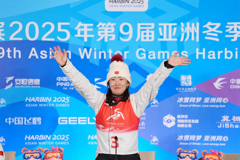 2月9日,中國選手徐夢桃在發布會現場。當日,第九屆亞冬會自由式滑雪女子個人空中技巧賽后新聞發布會在亞布力舉行。新華社記者 王松 攝