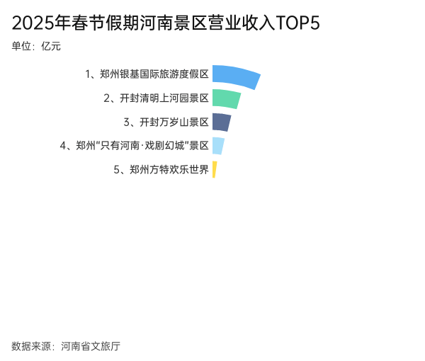 河南省文旅廳數據顯示,春節假期八天,全省營收上億元的景區僅有兩家,分別是鄭州銀基國際旅游度假區1.43億元,開封清明上河園景區1.03億元。