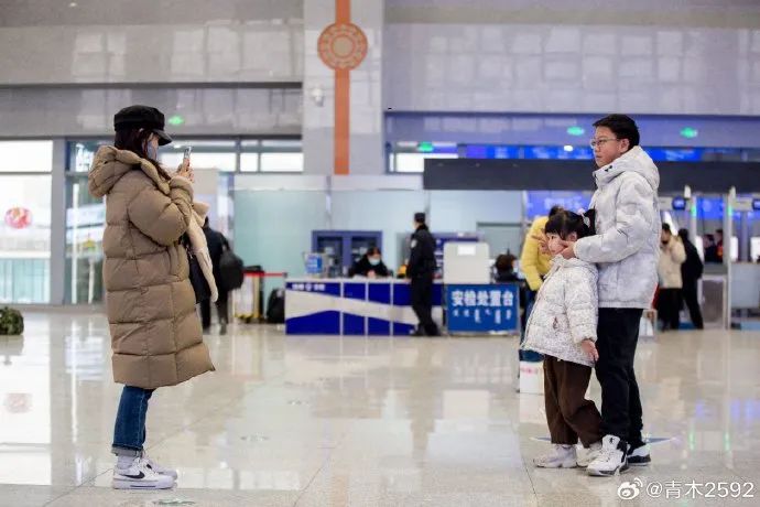 在外地上班的于女士,帶著女兒和前來送站的親人在車站內合影留念。
