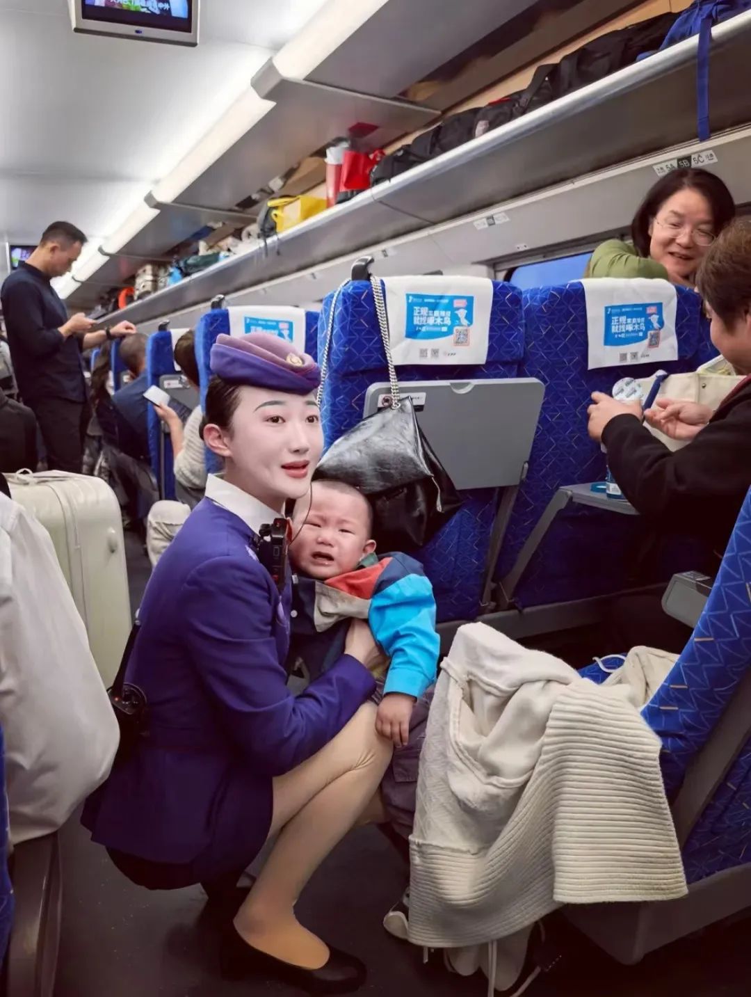 中國鐵路濟南局集團有限公司青島客運段北京動車隊的賈雯乘務員,耐心地幫助旅客安撫哭鬧的孩子,讓我在新的一年感受到了列車上的溫馨與真情。