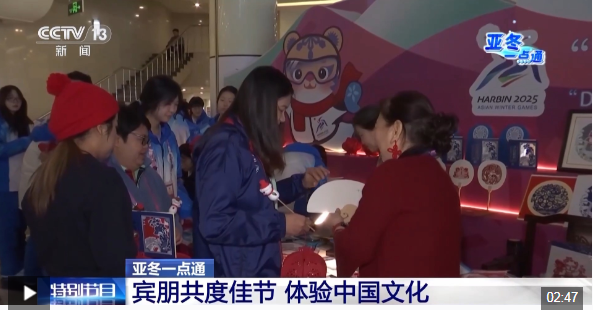 總臺央視記者 王晨:我現在是在位于哈爾濱亞冬會運動員村的一樓展廳,這里正在舉行“冰雪同夢·亞洲同心”非物質文化遺產展示活動。今天是開幕式后的第五個比賽日,展示活動持續進行中,有金漆技藝、方正剪紙、木雕重彩、皮影戲等非遺代表性項目展臺。