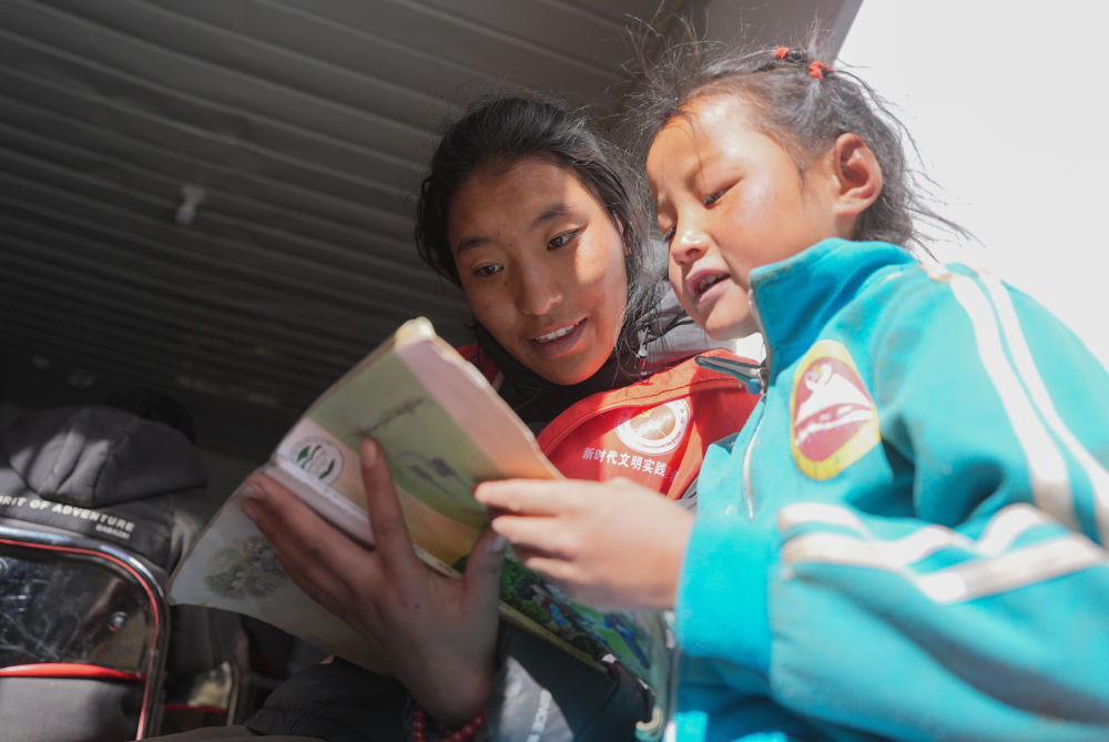 1月25日,在定日縣曲洛鄉(xiāng)熱木青村安置點,大學生志愿者在安置點在給孩子們輔導功課。新華社記者 晉美多吉 攝