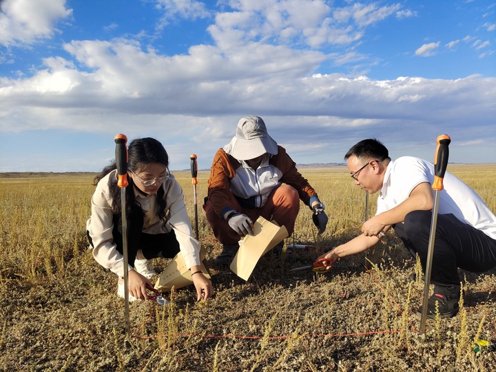 2024年生態質量地面監測中,薄文真(左一)和同事正在采集植物樣本。(受訪者供圖)