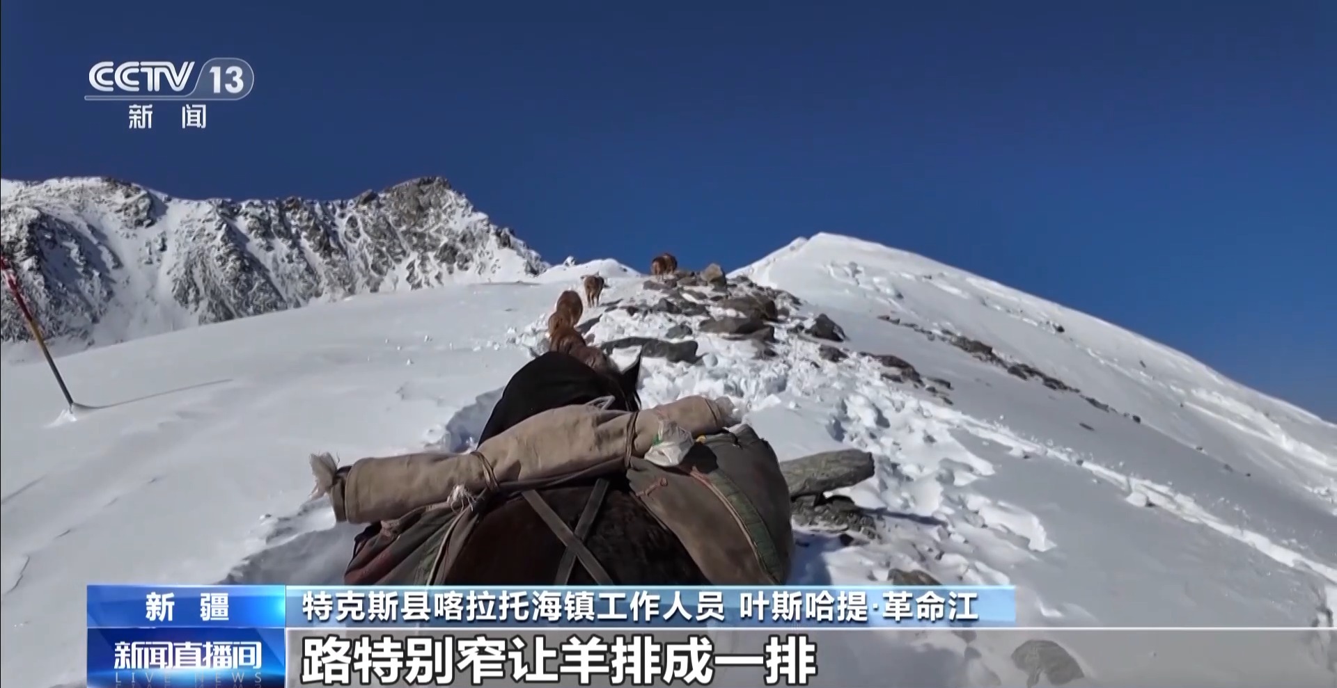 特克斯縣喀拉托海鎮 葉斯哈提·革命江:我們牧民到了達坂以后,這個路特別窄,讓羊排成一排,慢慢地上山。