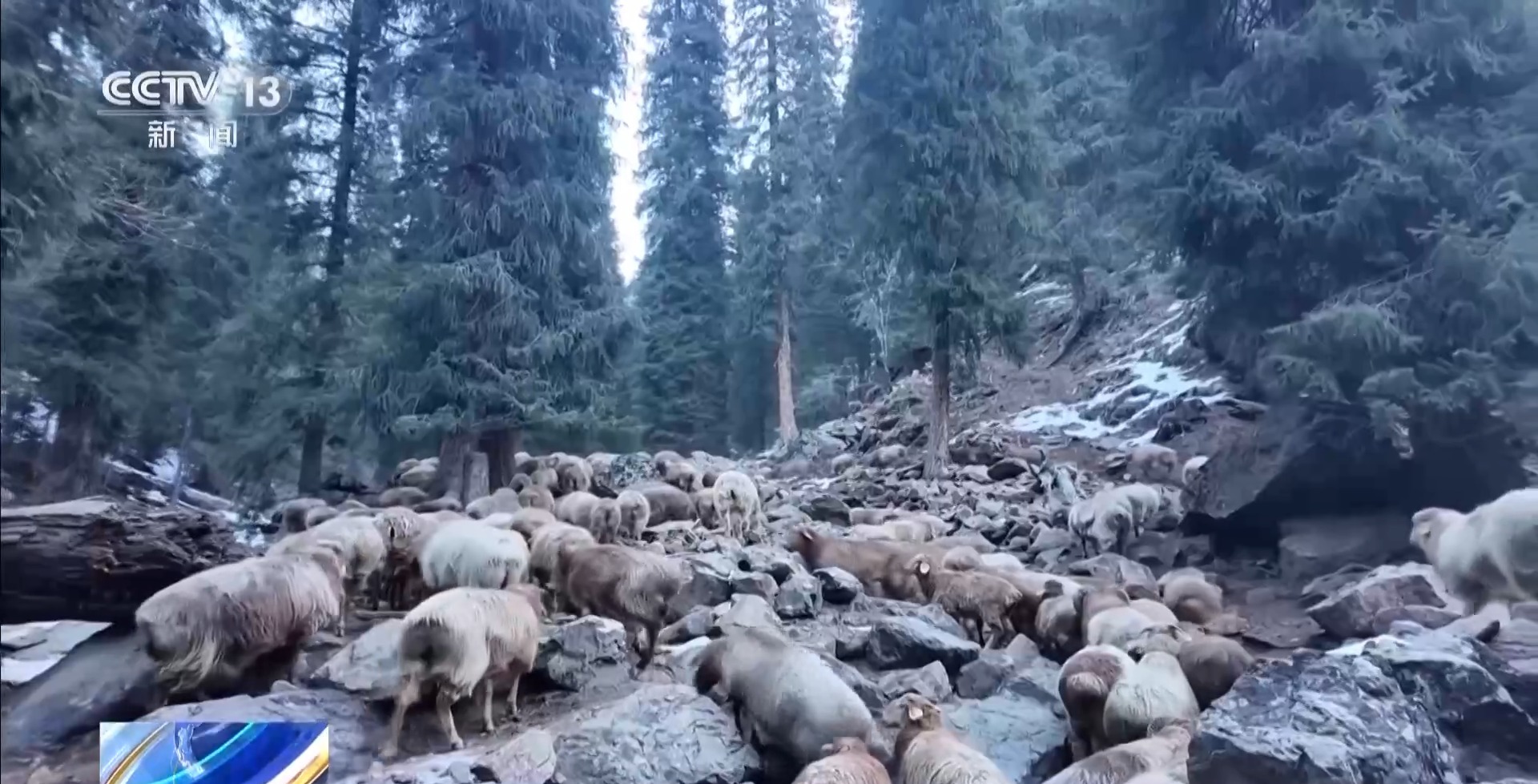翻過達坂后,轉場的隊伍到了山下的松林,這里的積雪沒有那么厚,但要穿過一條條冰河和結冰的山路才能繼續向前。為了防止牲畜摔倒,大家要先把危險路段的冰清理掉,再撒上土防滑,才能讓馬和羊一群群通過。即使這樣,依然有一只羊的腿受了傷,簡單包扎后才繼續上路。