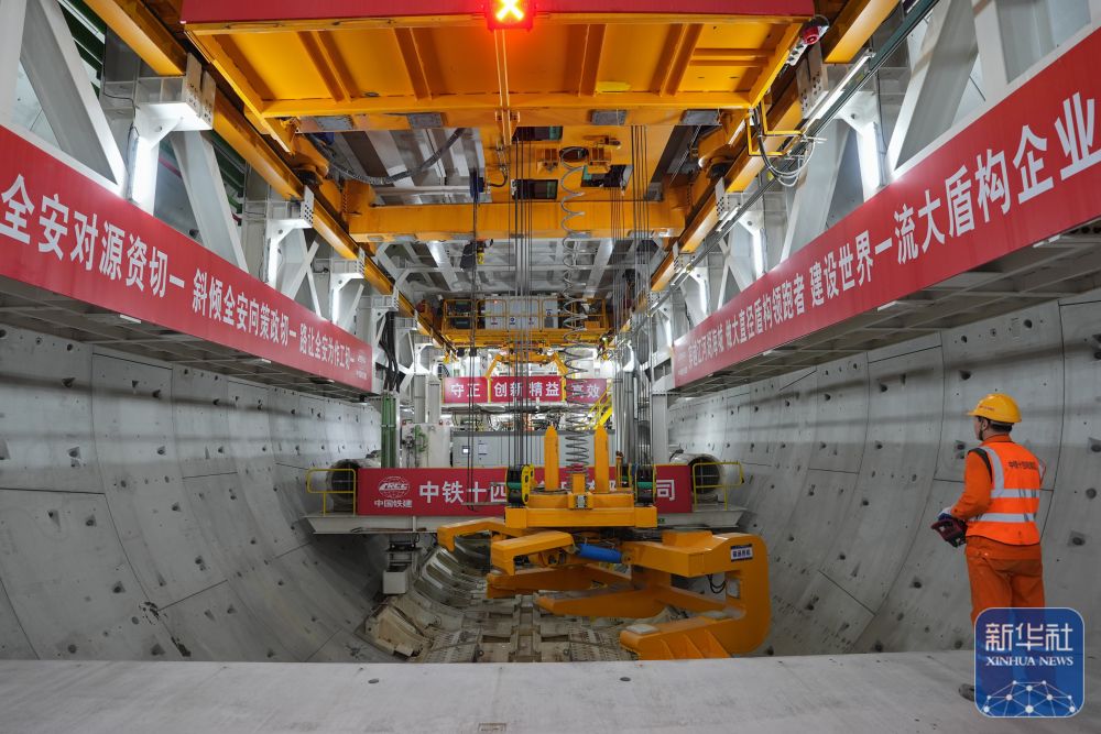 2月25日,中鐵十四局施工人員在甬舟鐵路金塘海底隧道“甬舟號”盾構機內進行管片拼裝作業。