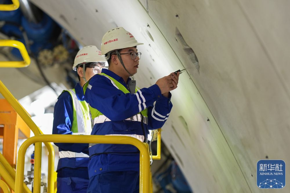 2月25日,中鐵十四局技術人員在甬舟鐵路金塘海底隧道“甬舟號”盾構機內測量管片拼裝作業情況。