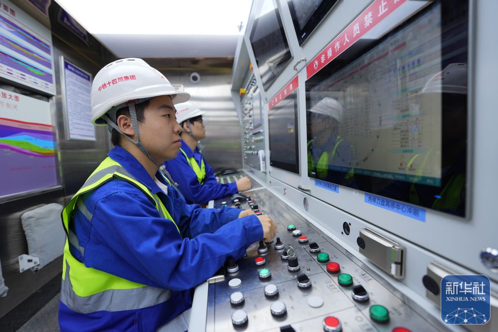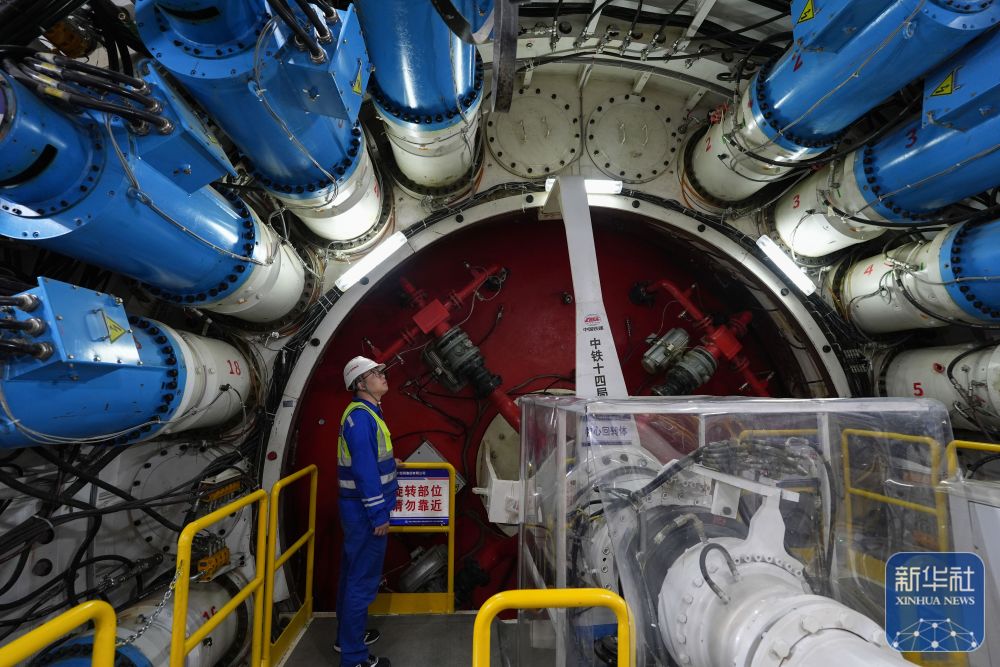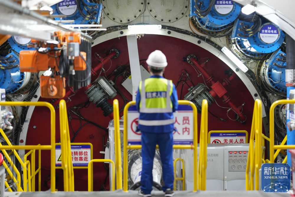 2月25日,中鐵十四局技術人員在甬舟鐵路金塘海底隧道“甬舟號”盾構機內關注設備運行情況。