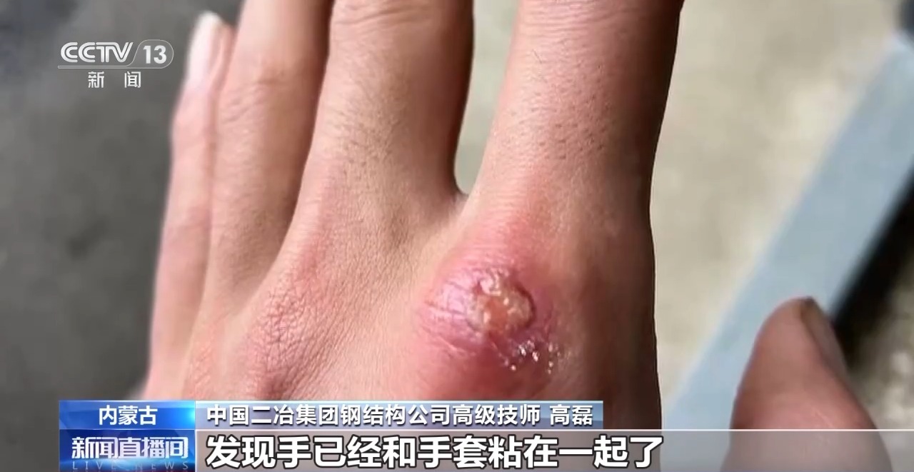 中國二冶集團鋼結構公司高級技師 高磊:如果你中途停止的話,再重新起弧就可能造成焊接缺陷,我就沒有選擇停,我就咬著牙堅持把這段焊縫完成,直到焊到最后,等我往下摘我的焊工手套的時候,發(fā)現(xiàn)手已經(jīng)和手套粘在一起了,燙出特別大一個水泡。