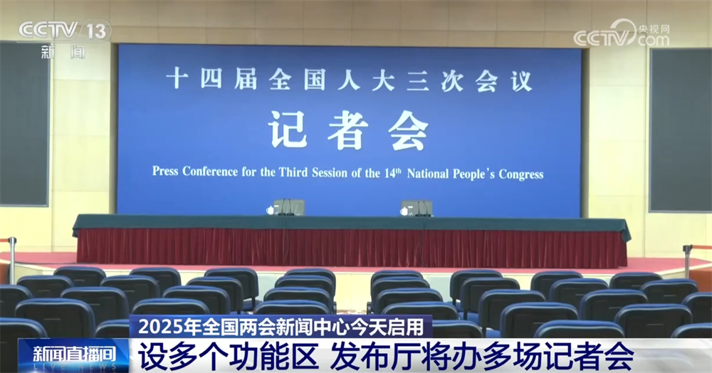 與往年相同,今年全國兩會新聞中心設置了多個功能區,其中,新聞發布廳和采訪室等已經布置完畢。