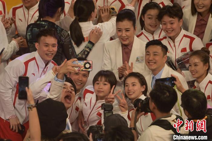 2024年8月30日,訪港的中國內地奧運健兒出席奧運健兒大匯演。圖為香港藝人與奧運健兒自拍。 中新社記者 陳永諾 攝