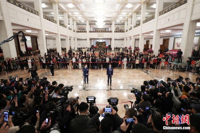 3月5日,十四屆全國人大三次會議首場“代表通道”集中采訪活動在北京人民大會堂舉行。全國人大代表、小米集團創始人、董事長兼首席執行官雷軍(右)、全國人大代表、海爾集團董事局主席、首席執行官周云杰接受采訪。中新社記者 富田 攝