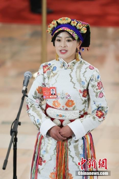 全國人大代表、四川省馬爾康市養護院院長格西王姆接受采訪。中新社記者 富田 攝