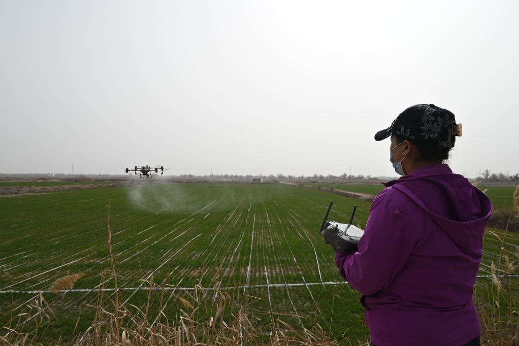 3月18日,在新疆喀什地區英吉沙縣一麥田,努日曼古麗正在操作無人機。新華社記者 尹茹紅 攝