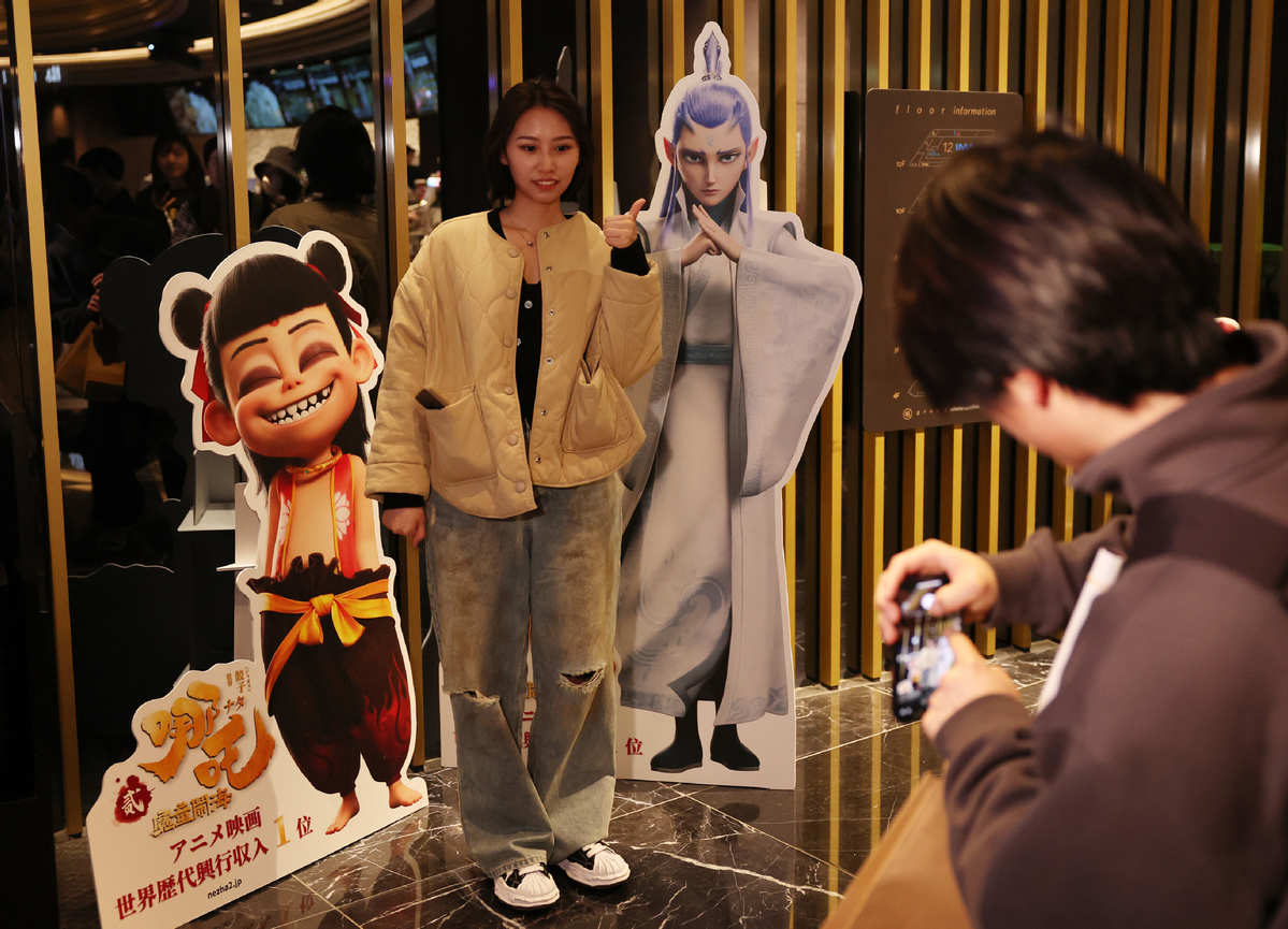 3月14日,在日本東京,一名觀眾在《哪吒之魔童鬧?!啡毡臼子呈胶笈c電影宣傳板合影。(圖片來源:新華社)