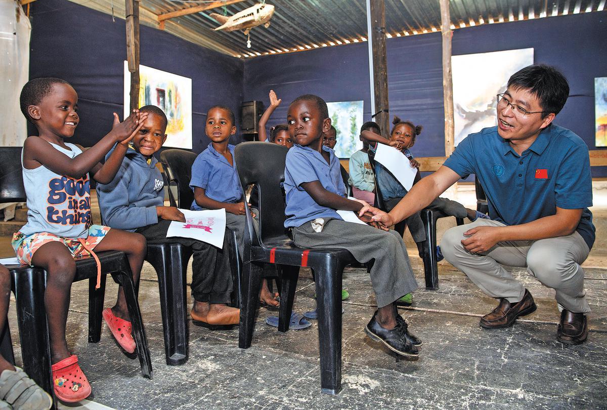 在納米比亞溫得和克的弗朗斯·南賓加藝術(shù)培訓(xùn)中心,一名中國醫(yī)療隊隊員向孩子們講解正確的洗手方法。(圖片/新華社)