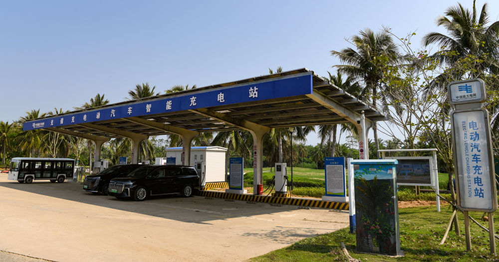 這是3月25日拍攝的博鰲零碳示范區(qū)內(nèi)的電動汽車充電站。