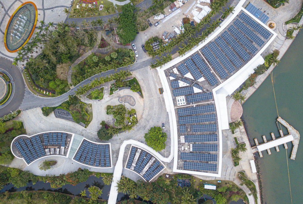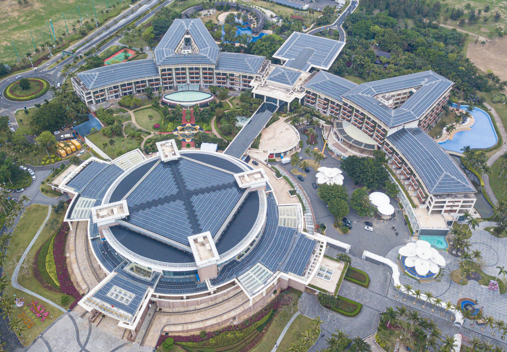 這是在博鰲零碳示范區(qū)拍攝的博鰲亞洲論壇新聞中心及配樓屋頂?shù)墓夥O(shè)備(無人機照片,3月16日攝)。