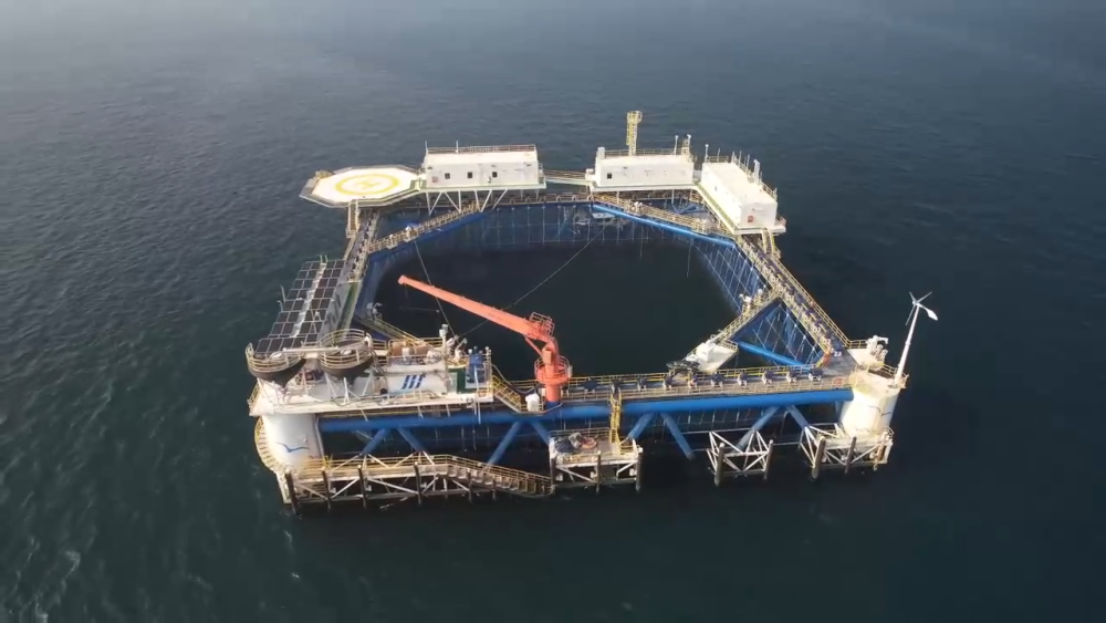 在距離大陸岸線42海里的海域坐落著這樣的深遠(yuǎn)海智能網(wǎng)箱平臺(tái),網(wǎng)箱長(zhǎng)寬均為68米,布設(shè)500個(gè)監(jiān)測(cè)點(diǎn),配備了聲納、激光雷達(dá)等設(shè)備。這樣的1個(gè)網(wǎng)箱每年能產(chǎn)出100萬(wàn)條魚,只需要4個(gè)工人來(lái)操作。