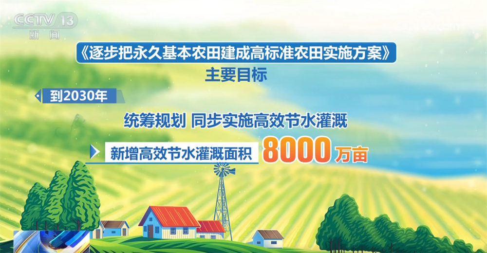 《實施方案》的主要目標是:到2030年,力爭累計建成高標準農田13.5億畝,累計改造提升2.8億畝,統(tǒng)籌規(guī)劃、同步實施高效節(jié)水灌溉,新增高效節(jié)水灌溉面積8000萬畝;到2035年,力爭將具備條件的永久基本農田全部建成高標準農田,累計改造提升4.55億畝,新增高效節(jié)水灌溉面積1.3億畝。