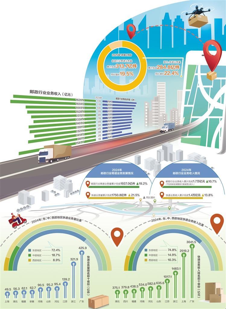 跨越式發(fā)展背后也是超大規(guī)模市場的有力支撐。去年全國網(wǎng)上零售額增長7.2%,連續(xù)12年成為全球最大網(wǎng)絡(luò)零售市場,這為快遞業(yè)發(fā)展提供了廣闊空間。從區(qū)域結(jié)構(gòu)看,去年以來,行業(yè)企業(yè)積極破解新疆、內(nèi)蒙古等地“不包郵”問題,有力激發(fā)中西部地區(qū)消費(fèi)潛力。2024年,中部、西部快遞業(yè)務(wù)量同比增長30%、35%,成為支撐快遞規(guī)模增長的新引擎。