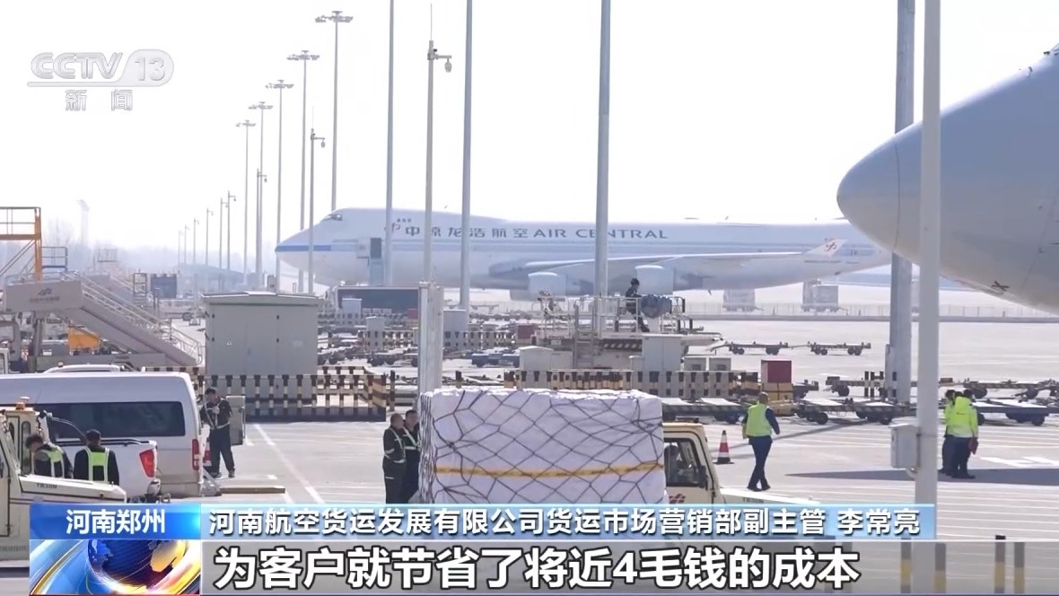 河南航空貨運(yùn)發(fā)展有限公司貨運(yùn)市場(chǎng)營(yíng)銷部 李常亮:時(shí)效能夠提升3到6個(gè)小時(shí),而且我們現(xiàn)在對(duì)中轉(zhuǎn)貨實(shí)行一次性收費(fèi),算下來(lái)相當(dāng)于我們一公斤為客戶就節(jié)省了將近4毛錢的成本。