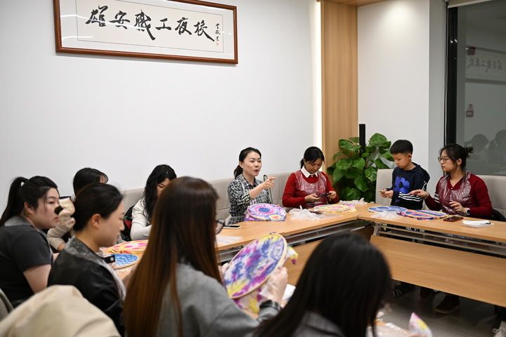 雄安新區職工夜校的學員在容東康寧雄觀書屋內制作扎染(2025年3月14日攝)。新華社記者 牟宇 攝