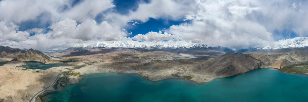 新疆帕米爾高原上公格爾九別峰和慕士塔格峰山腳下的湖泊濕地景觀(2020年6月16日攝,無人機全景照片)。新華社記者 胡虎虎 攝
