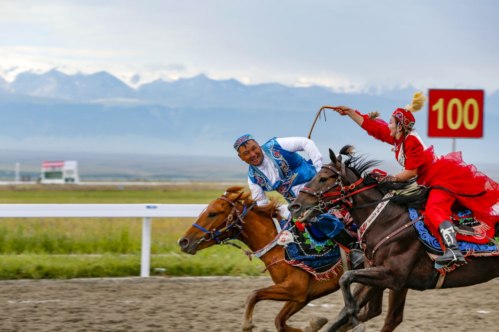 2024年7月10日,新疆代表團運動員在新疆昭蘇參加表演項目競技類“姑娘追”比賽。新華社記者 陳朔 攝