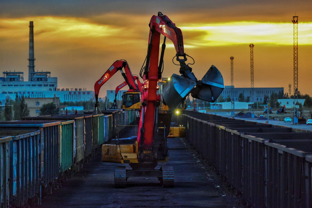 新疆霍爾果斯站換裝庫換十線抓料機對散堆裝貨物換裝作業(yè)(2023年9月6日攝)。新華社記者 趙戈 攝