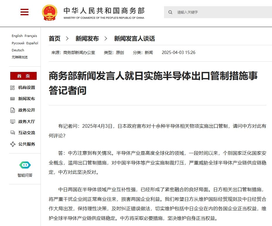 有記者問:2025年4月3日,日本政府宣布對十余種半導(dǎo)體相關(guān)物項(xiàng)實(shí)施出口管制,請問中方對此有何評(píng)論?